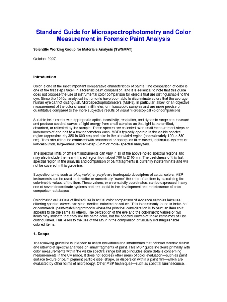 Standard Guide For Microspectrophotometry And Color Measurement In Forensic Paint Analysis Ultraviolet Visible Spectroscopy Color - Microspectrophotometry followed by chemometric data analysis was conducted on pairs of visually similar blue acrylic fibers, simulating the questioned versus known scenarios often encountered in forensic casework.